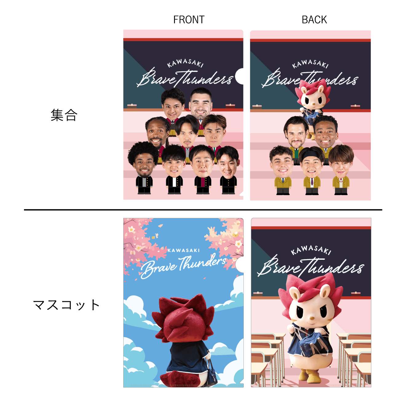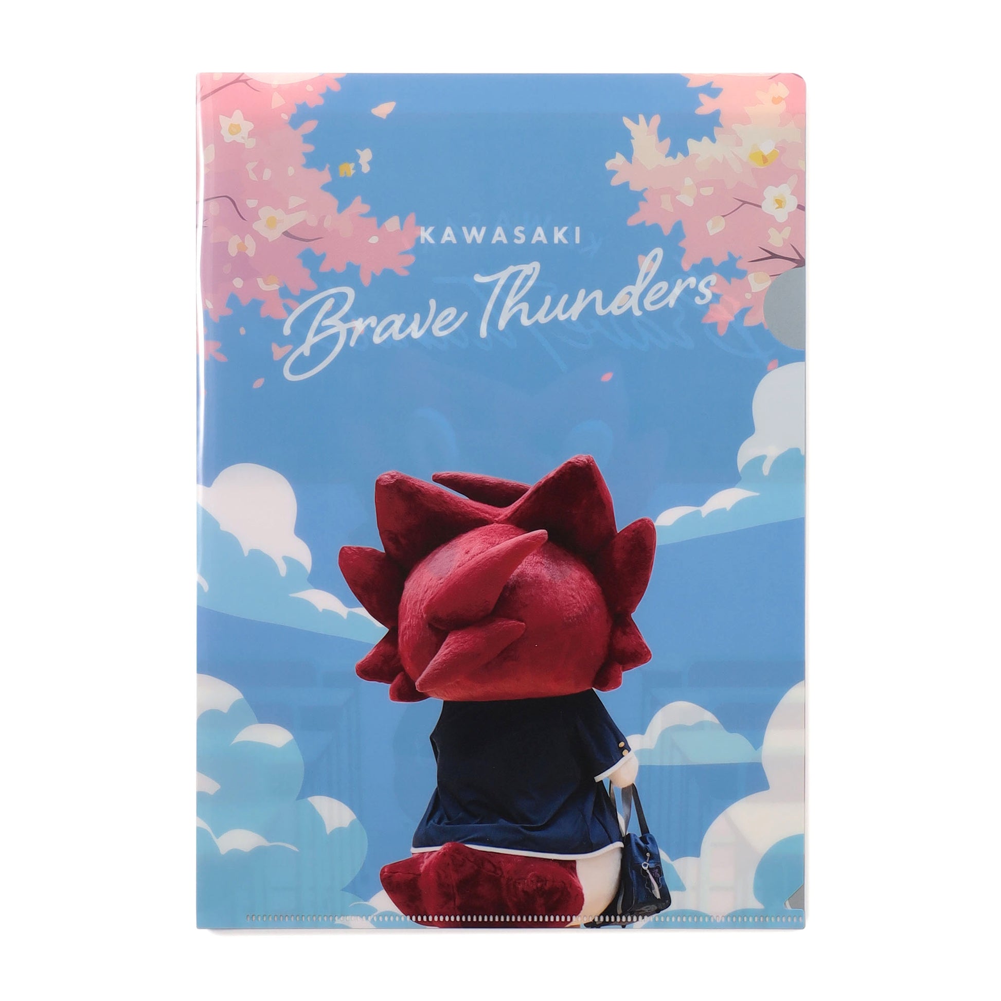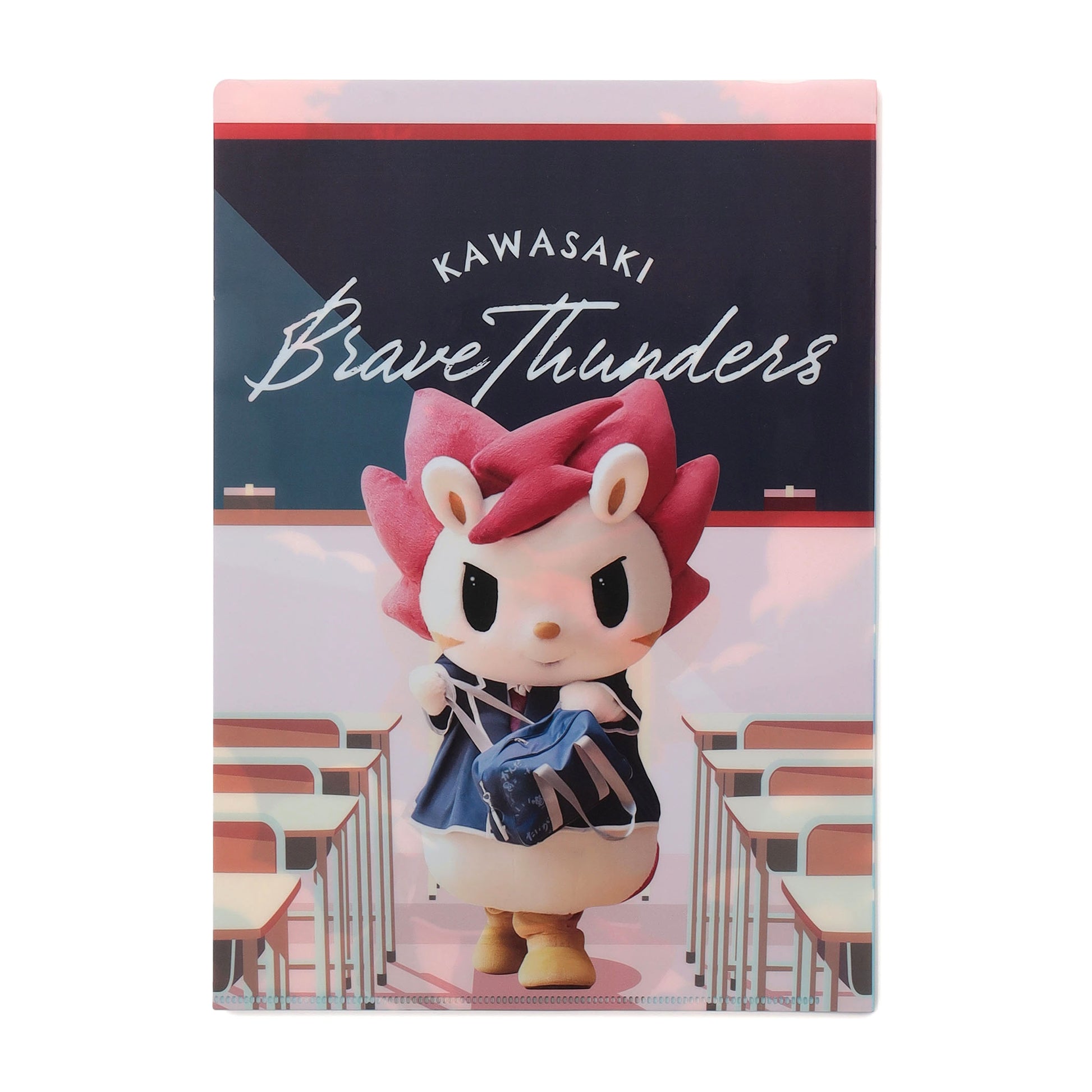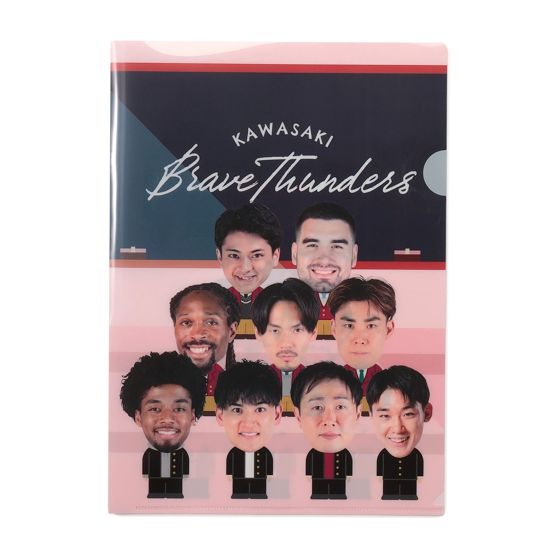 プリントや資料の整理に便利なクリアファイル。川崎ブレイブサンダースの選手と、マスコット ロウルが制服を着ているユニークなデザインが魅力です。