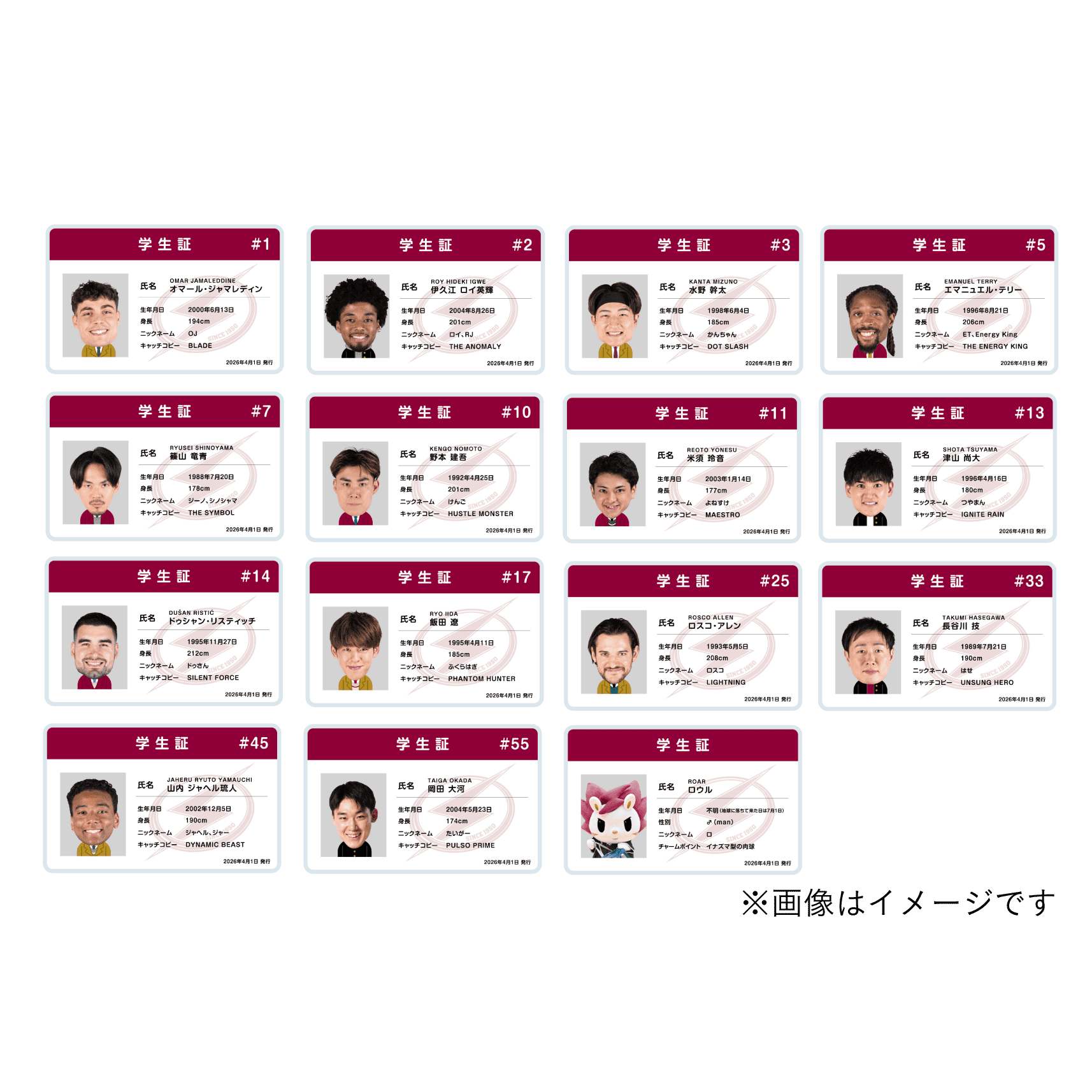貴重な制服姿の選手たちの学生証風なカードです。誕生日、身長、ニックネーム、キャッチコピーが書かれたユニークなアイテム。
