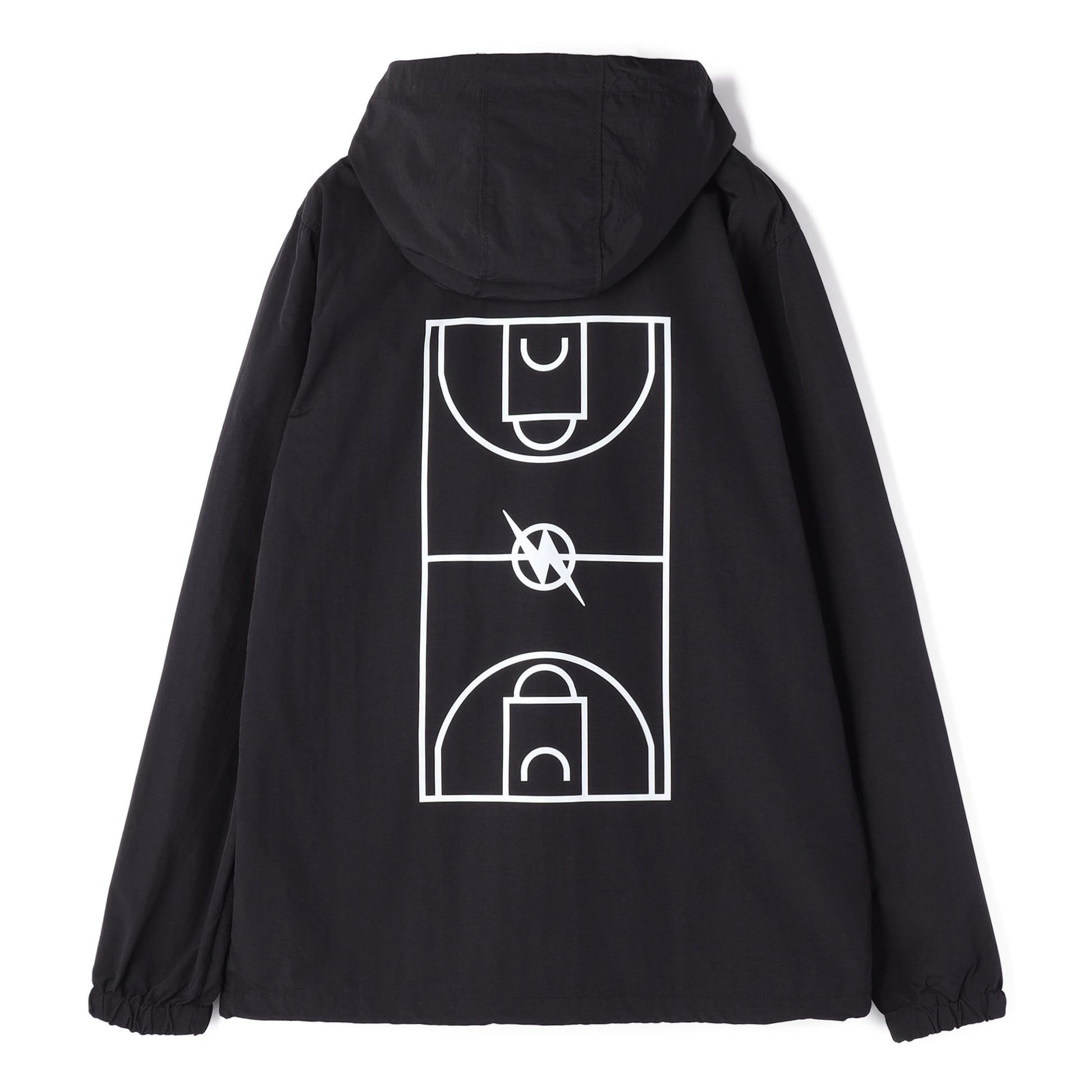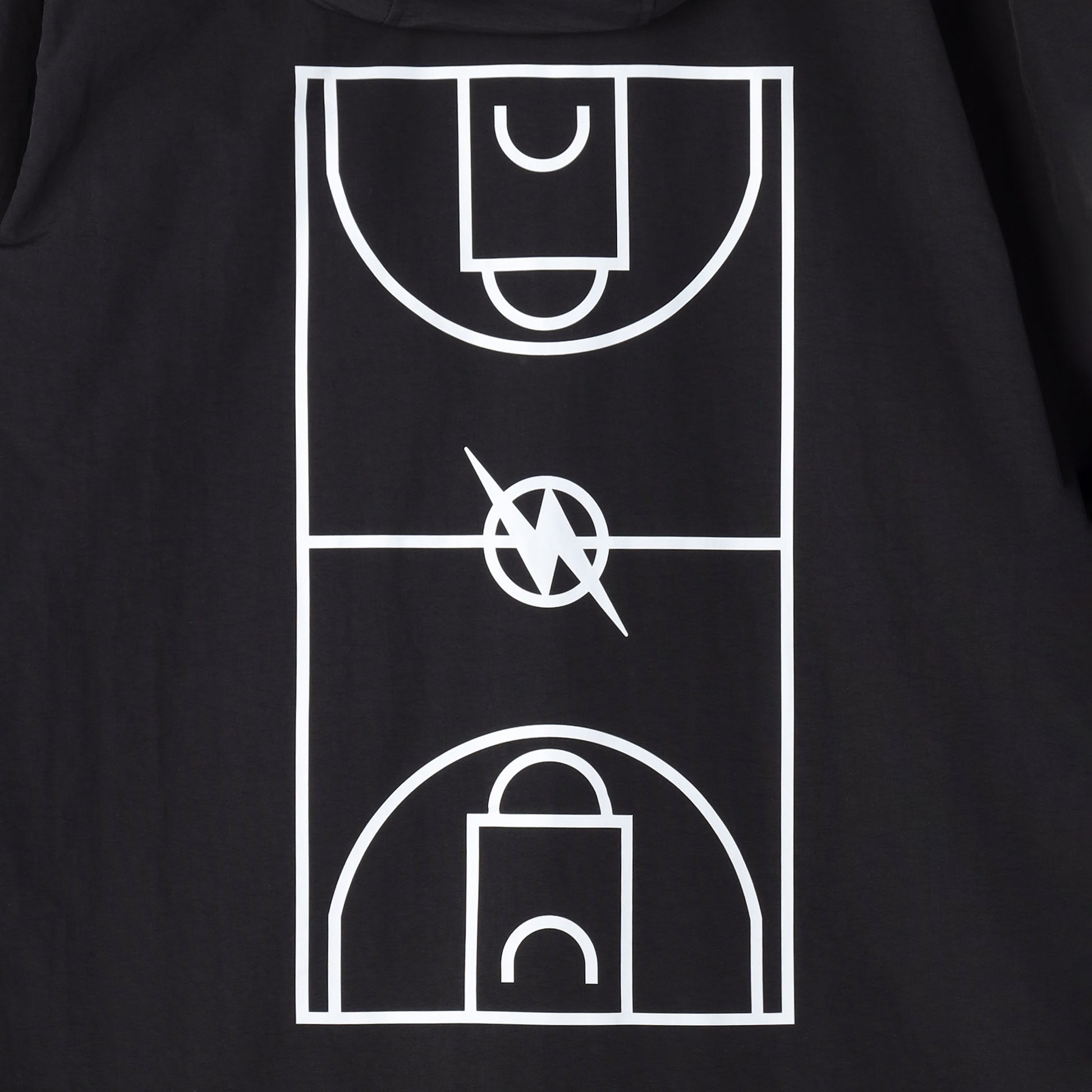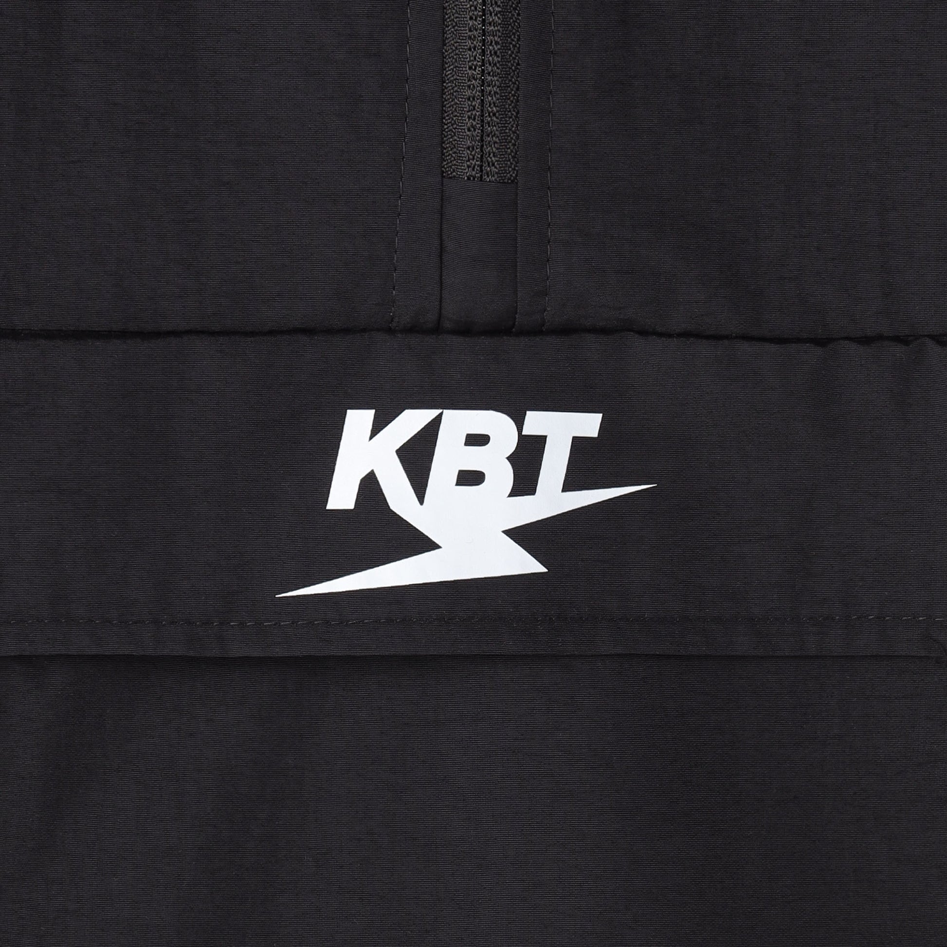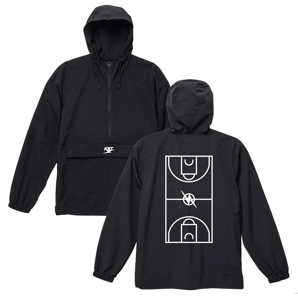 川崎ブレイブサンダースの略称KBTのロゴ入りアノラックパーカー。バスケットボールコートがグラフィカルにデザインされたバックプリントがスタイリッシュなデザイン。ゆとりのあるシルエットで重ね着に便利。デイリーに活躍するアイテムです。