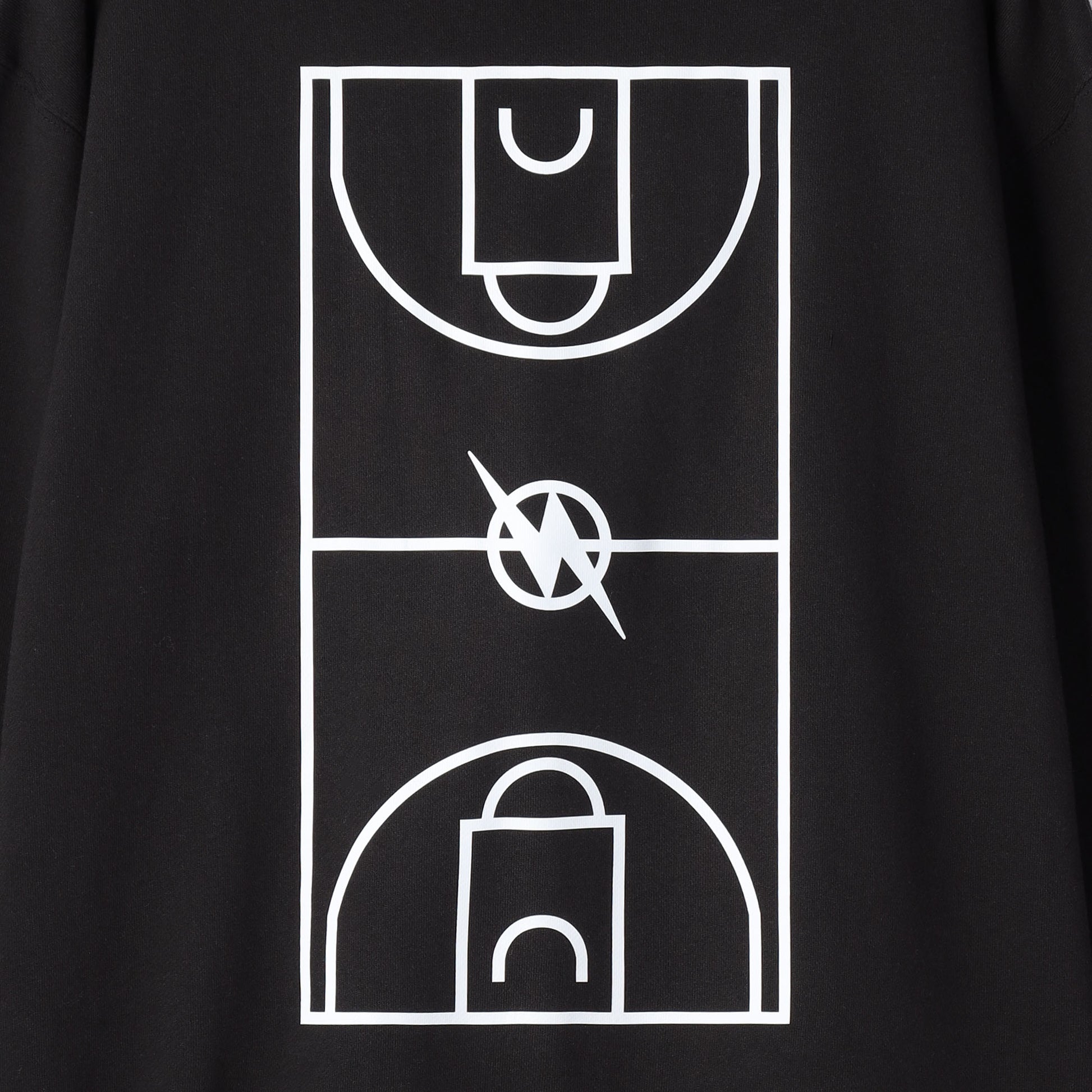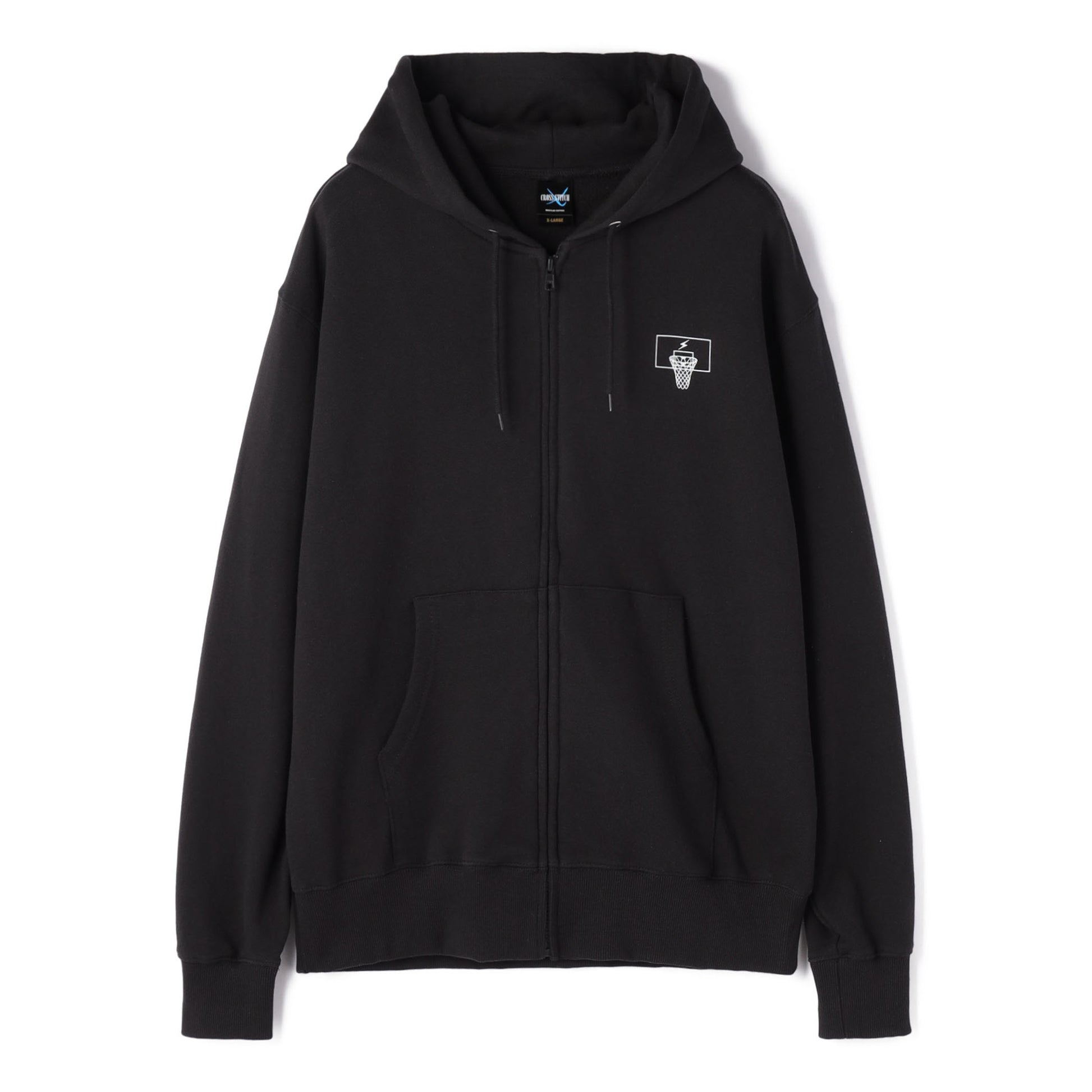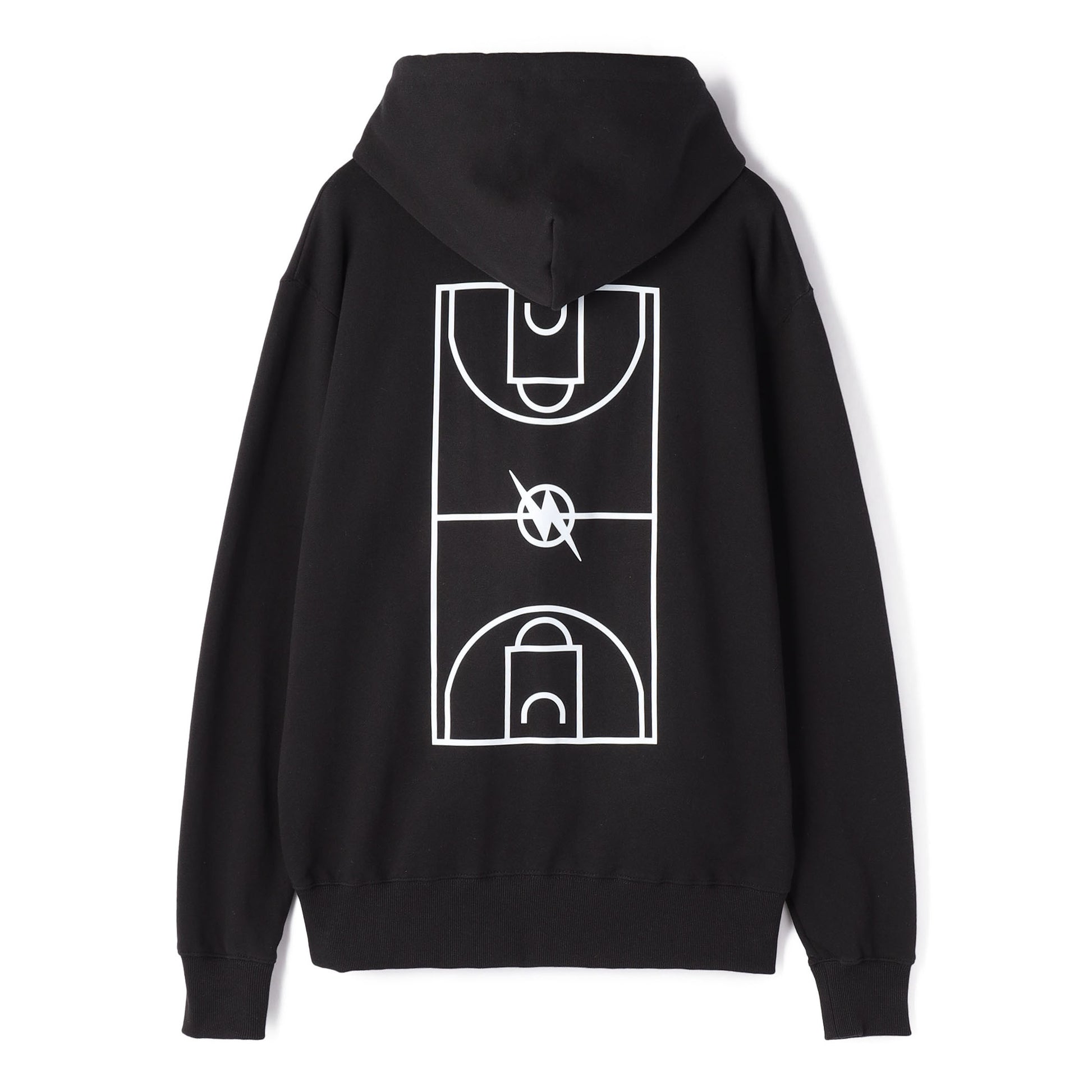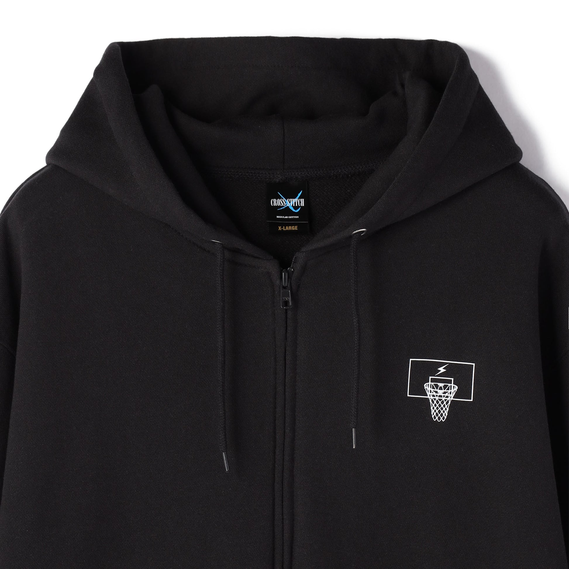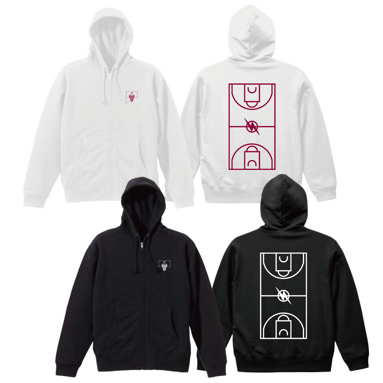 川崎ブレイブサンダースのオリジナル長袖ジップアップフーディ。左胸のバスケットゴール、バスケットボールコートがグラフィカルにデザインされたバックプリントがスタイリッシュなデザイン。さっと羽織れて便利なアイテム。デイリーに活躍します。