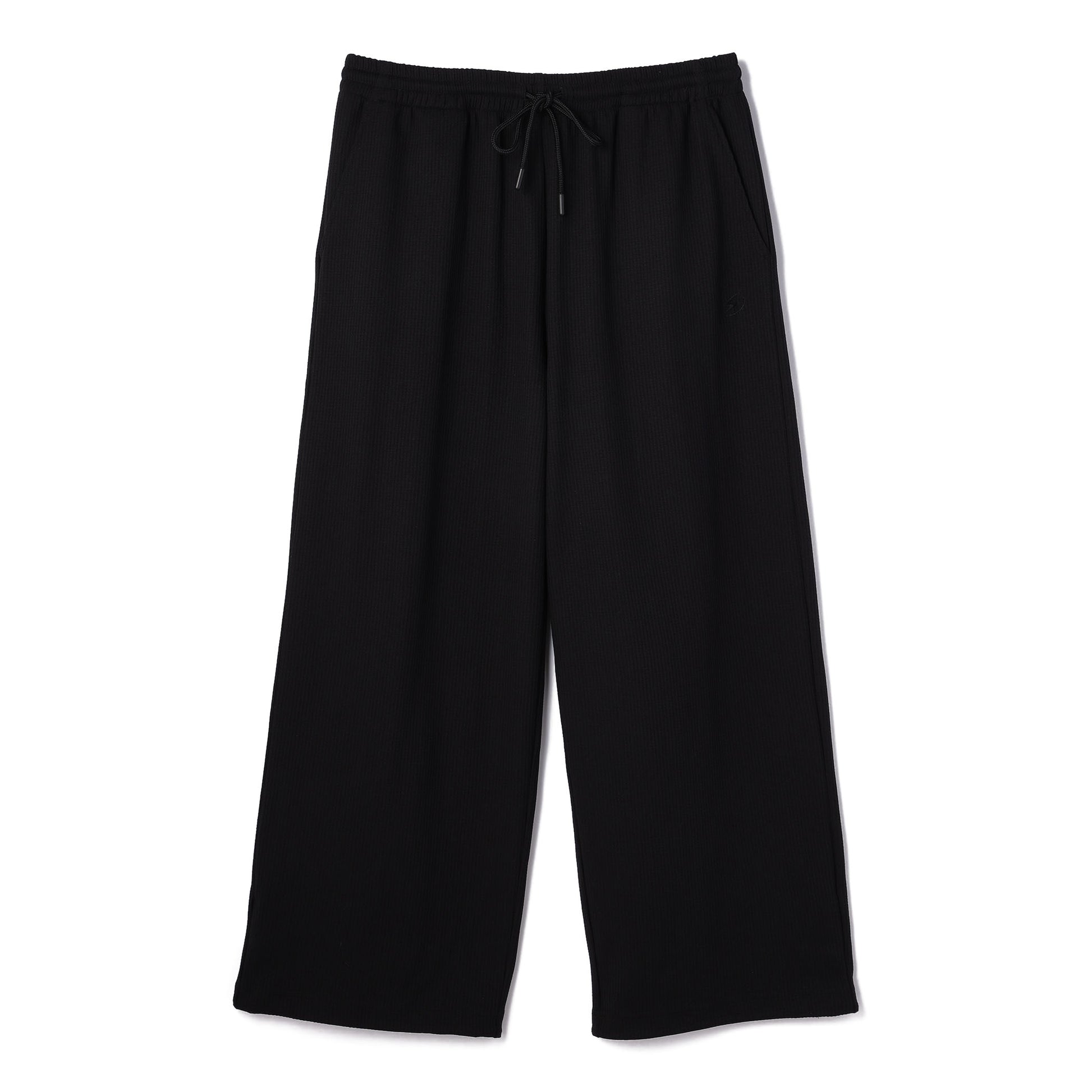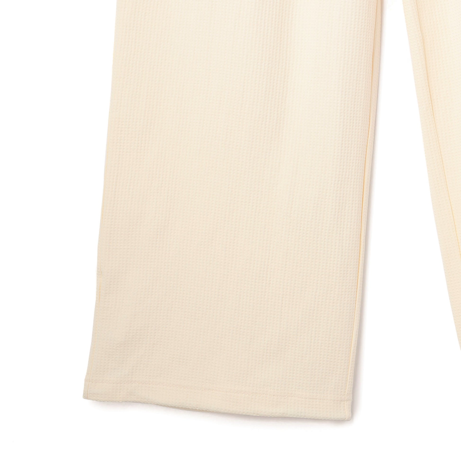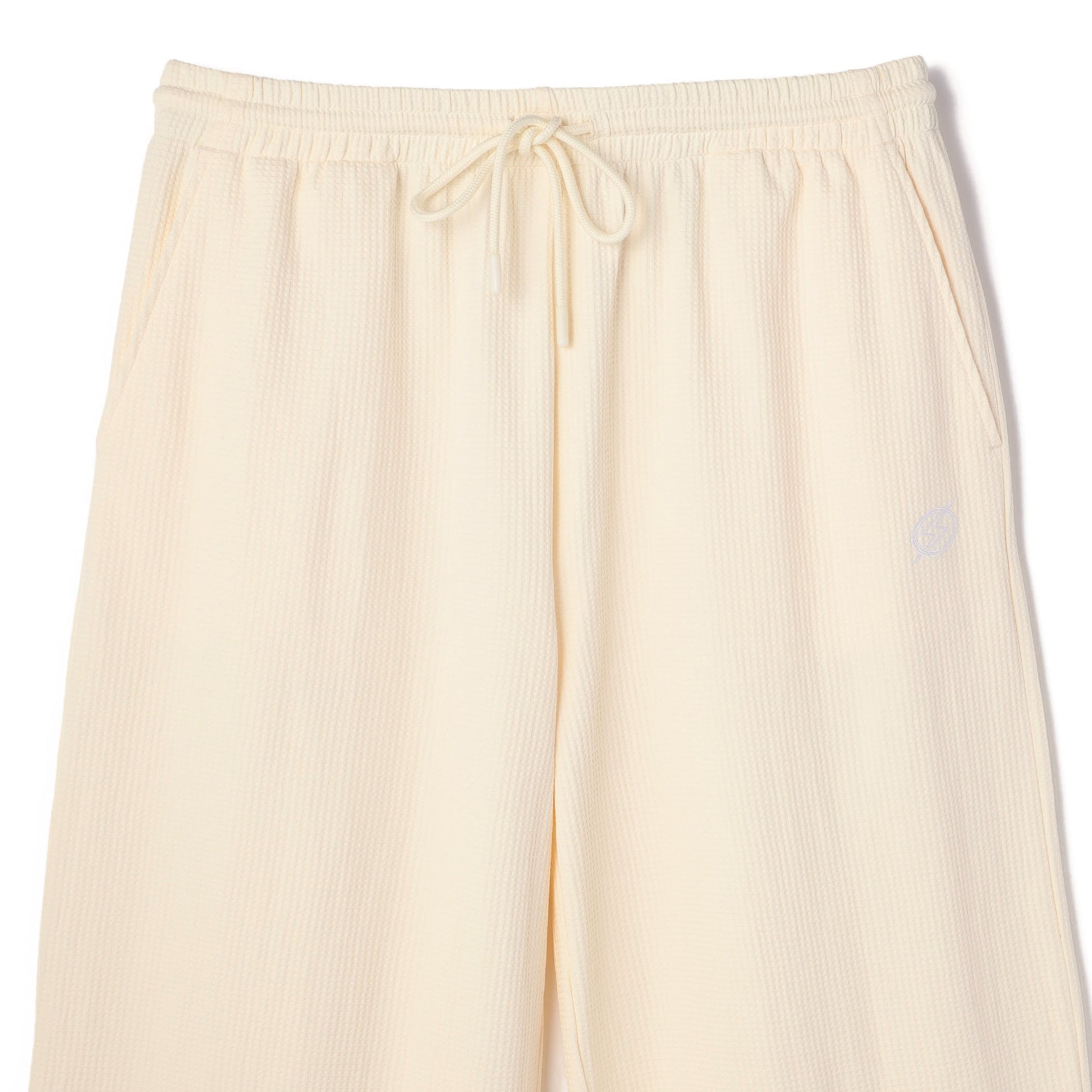 肌触りが良く快適な履き心地のワッフルパンツ。シンプルなデザインはスタイリングに合わせやすくおすすめです。ウエストはフィット感の調整ができるドローストリング仕様。サイドとバックにポケットを配置。左腿にはさりげなく川崎ブレイブサンダースのプライマリーロゴを添えています。