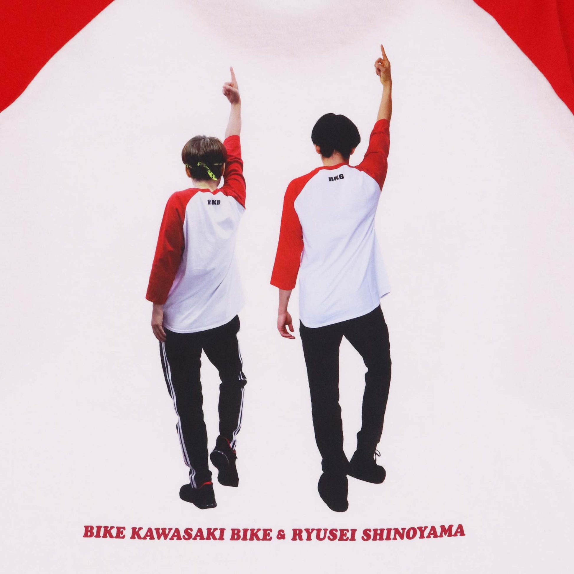 バイク川崎バイクさんといえばラグランTシャツ。芸人さんへのリスペストを込めたとっておきの一枚として、前面には描き下ろしイラスト、背面にはバイク川崎バイクさんと同じポーズをした篠山竜青選手の実写がデザインされています。