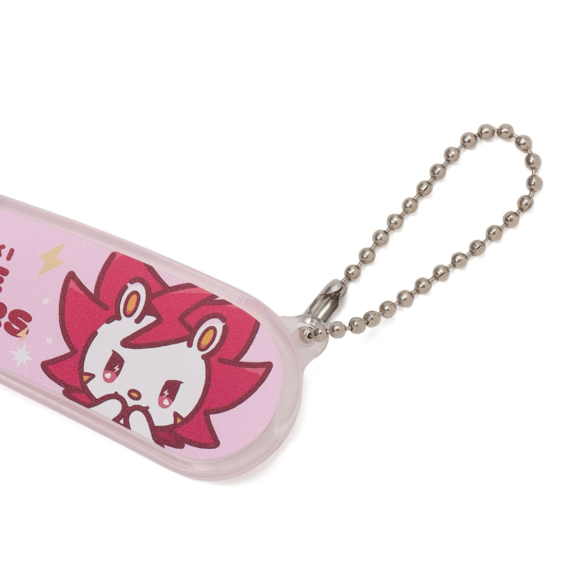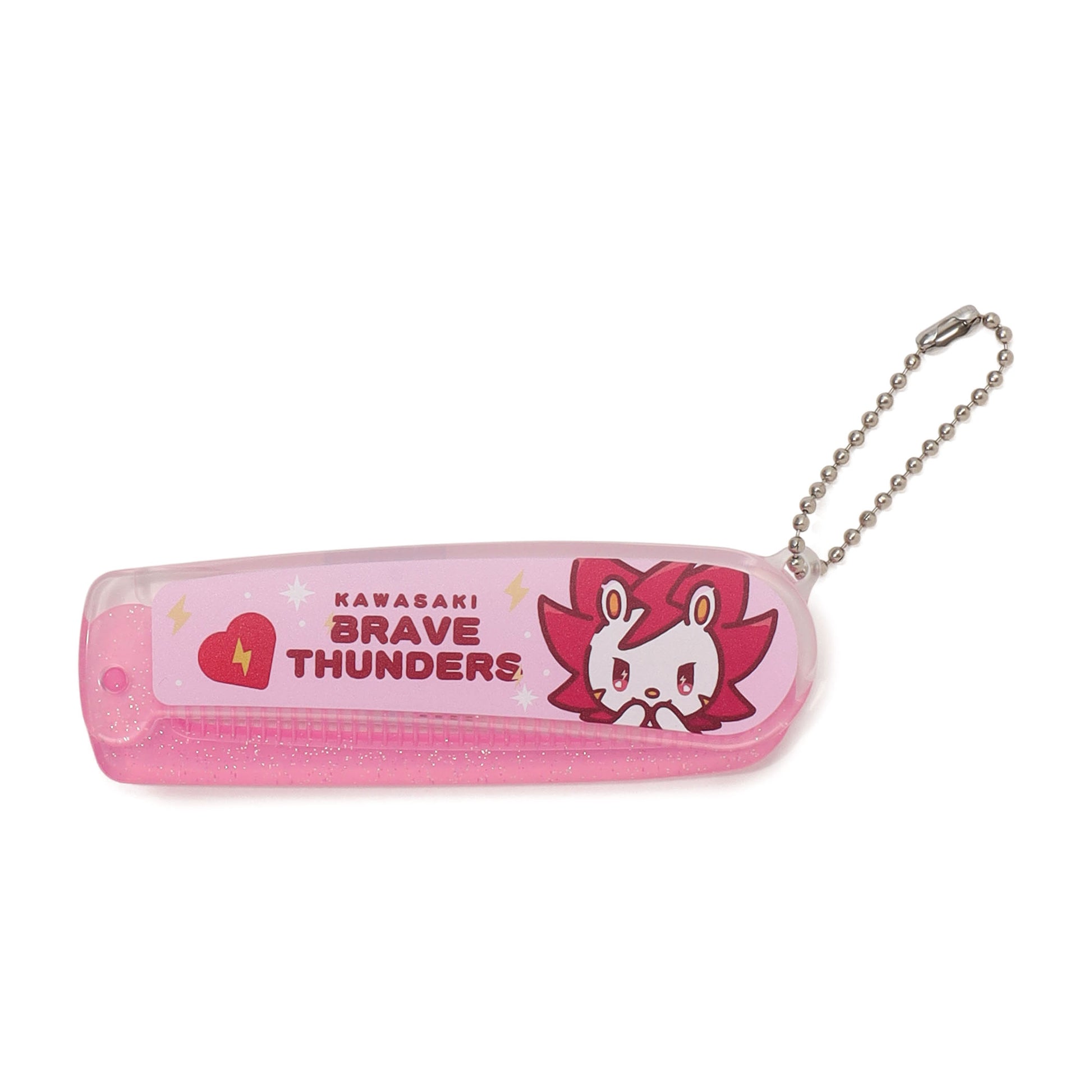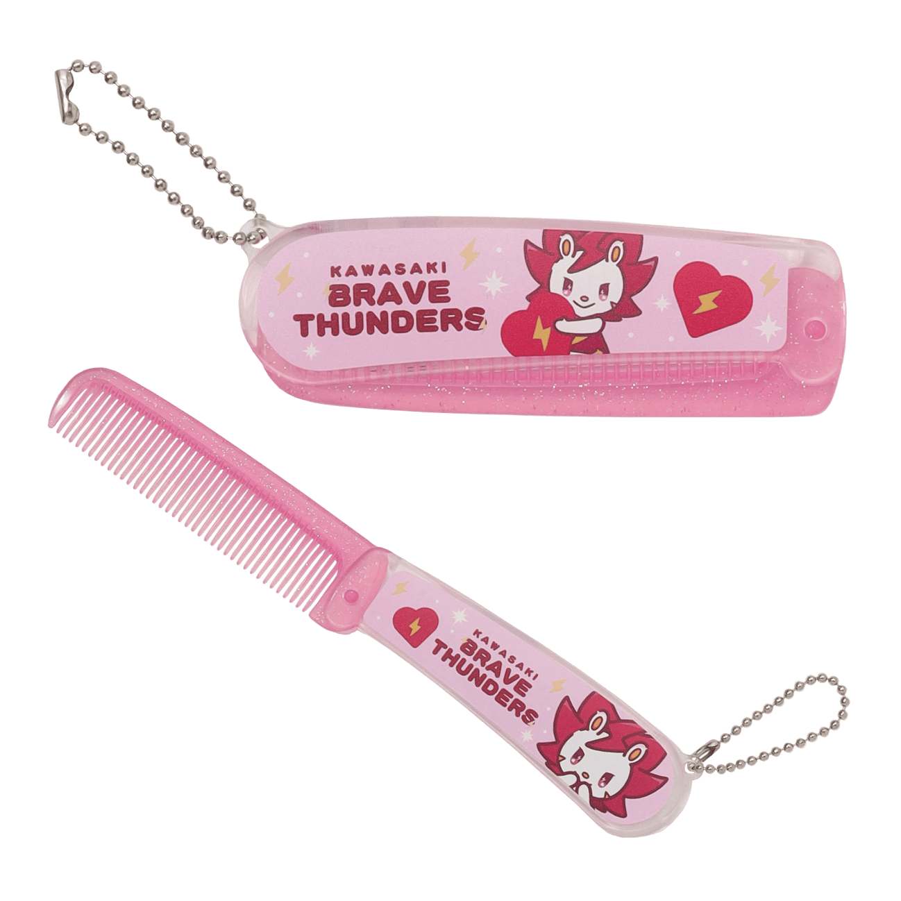 川崎ブレイブサンダースのマスコット ロウルのイラスト入りコーム。2つに折りたためる、携帯に便利なコンパクトなサイズ感、取り付け簡単なボールチェーン付きの便利な仕様。コーム部分はキラッと光る可愛らしいラメ入り。デイリーに活躍するアイテムです。